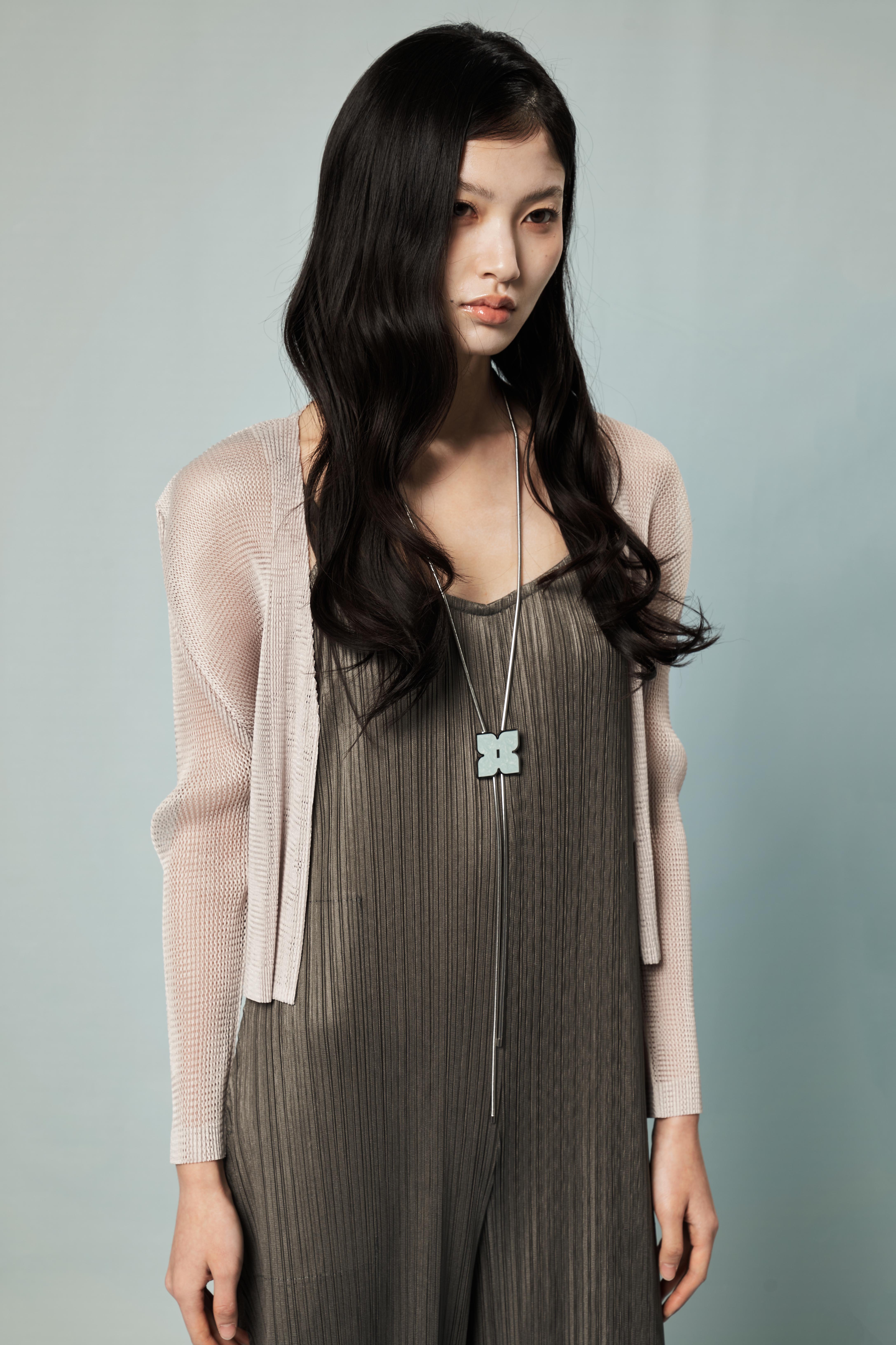 “Midi-crop cardigan that adds a seasonal mood with its lightly sheer mesh texture.”
