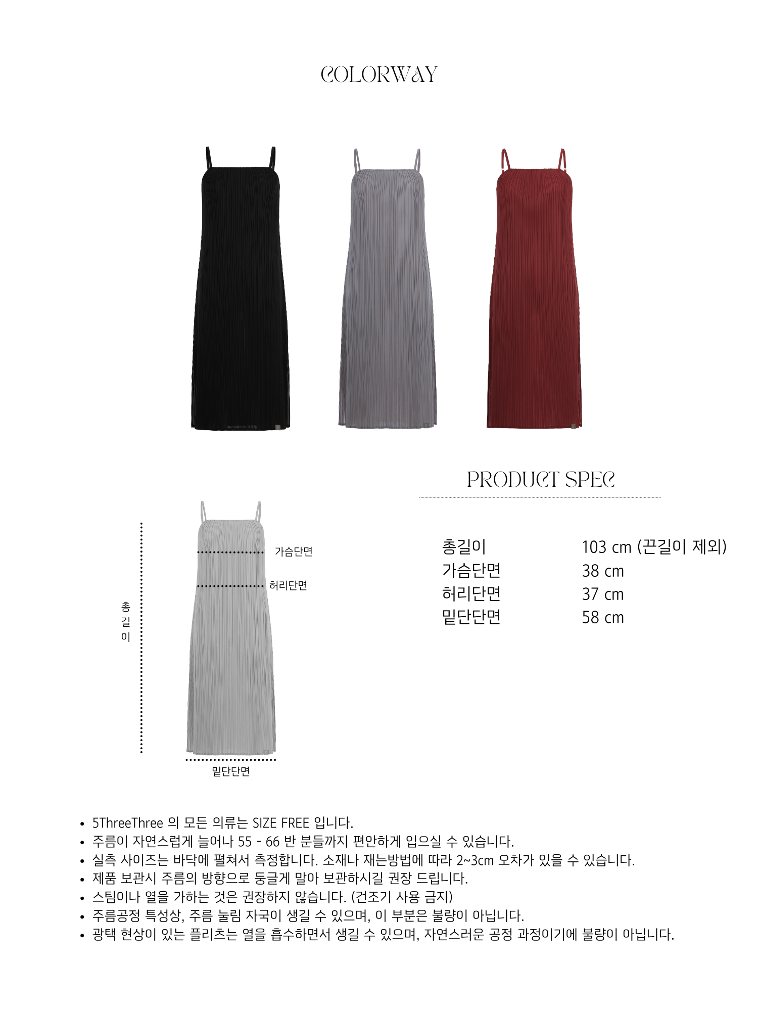 Fit Advise 5threethree 의 모든 의류는 Free Size 입니다. 55 - 66 반 분들까지 편안하게 입으실 수 있습니다. 보다 정확한 치수는 Product Spec을 확인 부탁드리겠습니다.