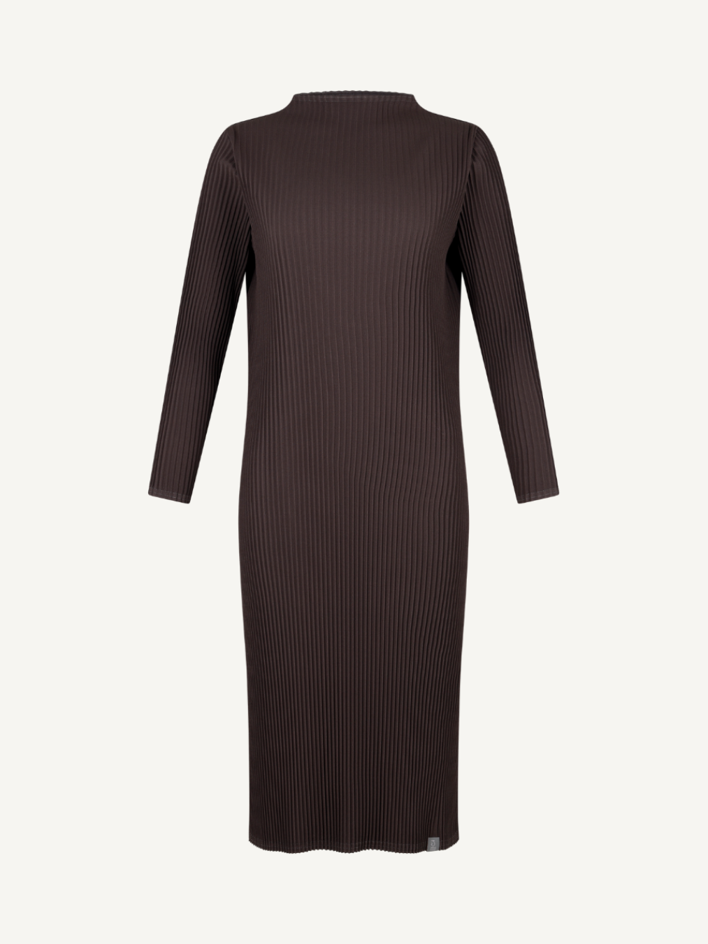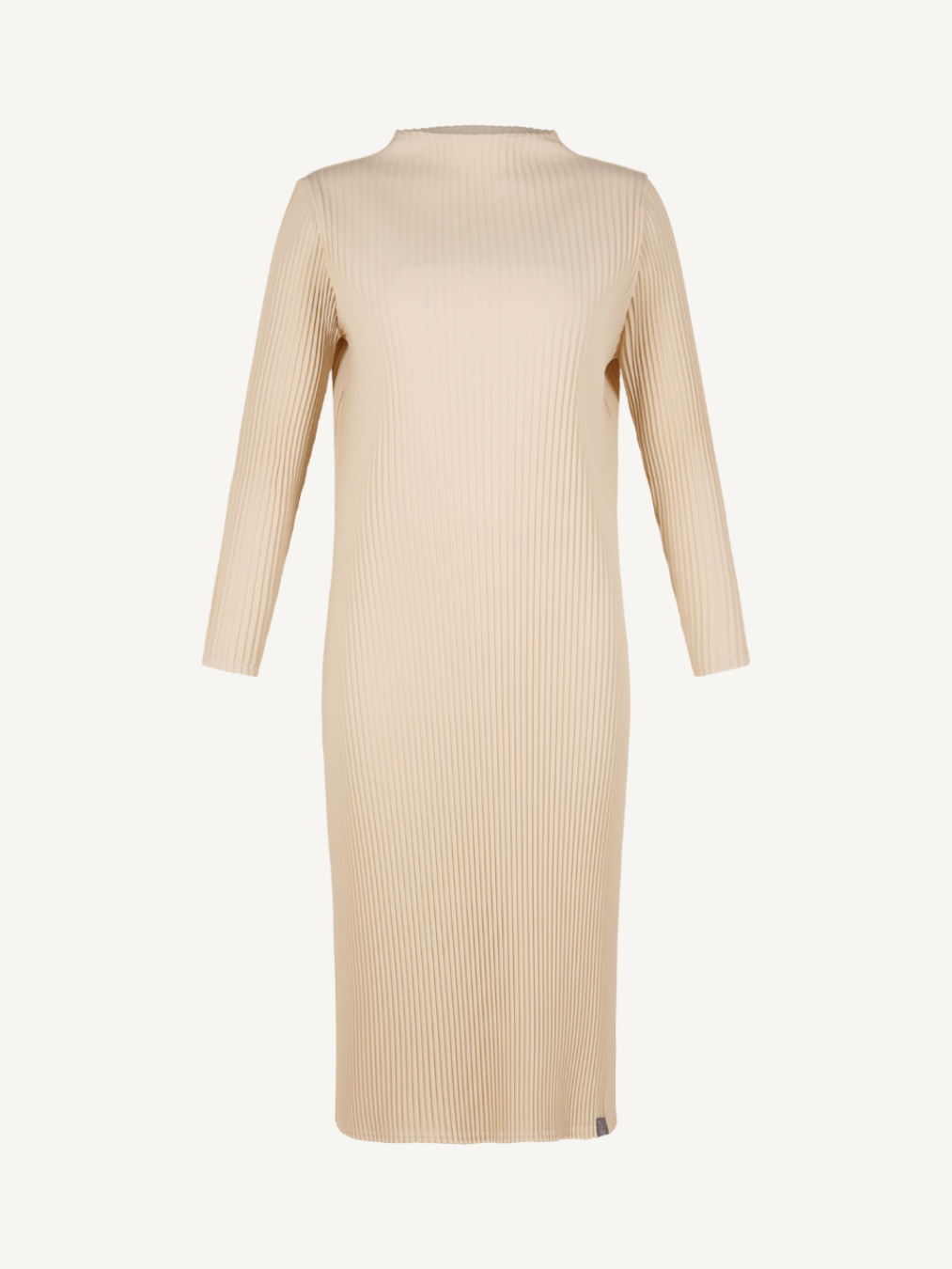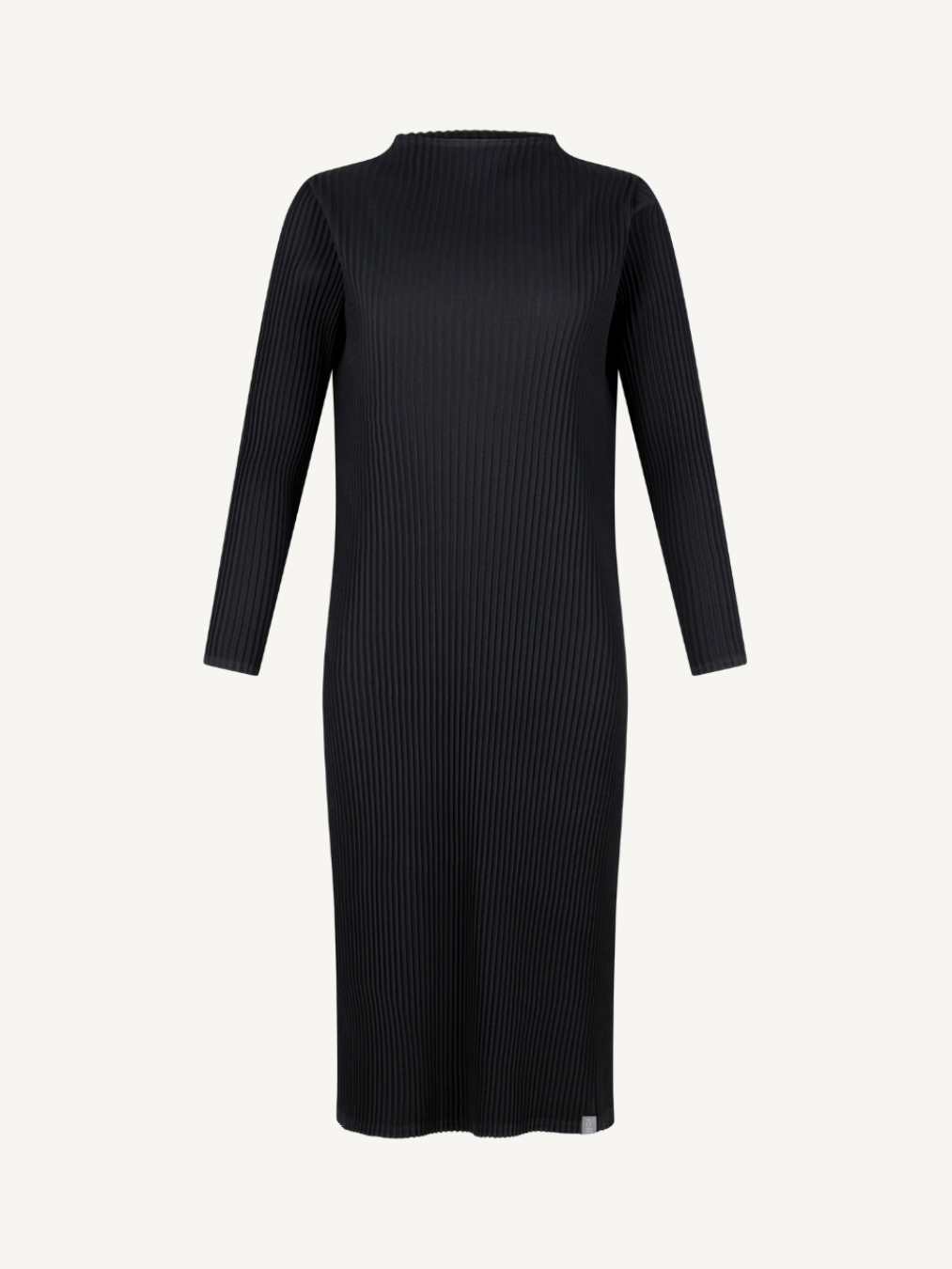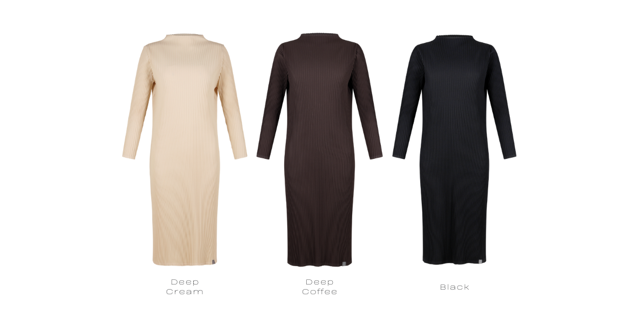“Mock-neck dress that gently contours the body, defined by a minimal yet composed silhouette.”