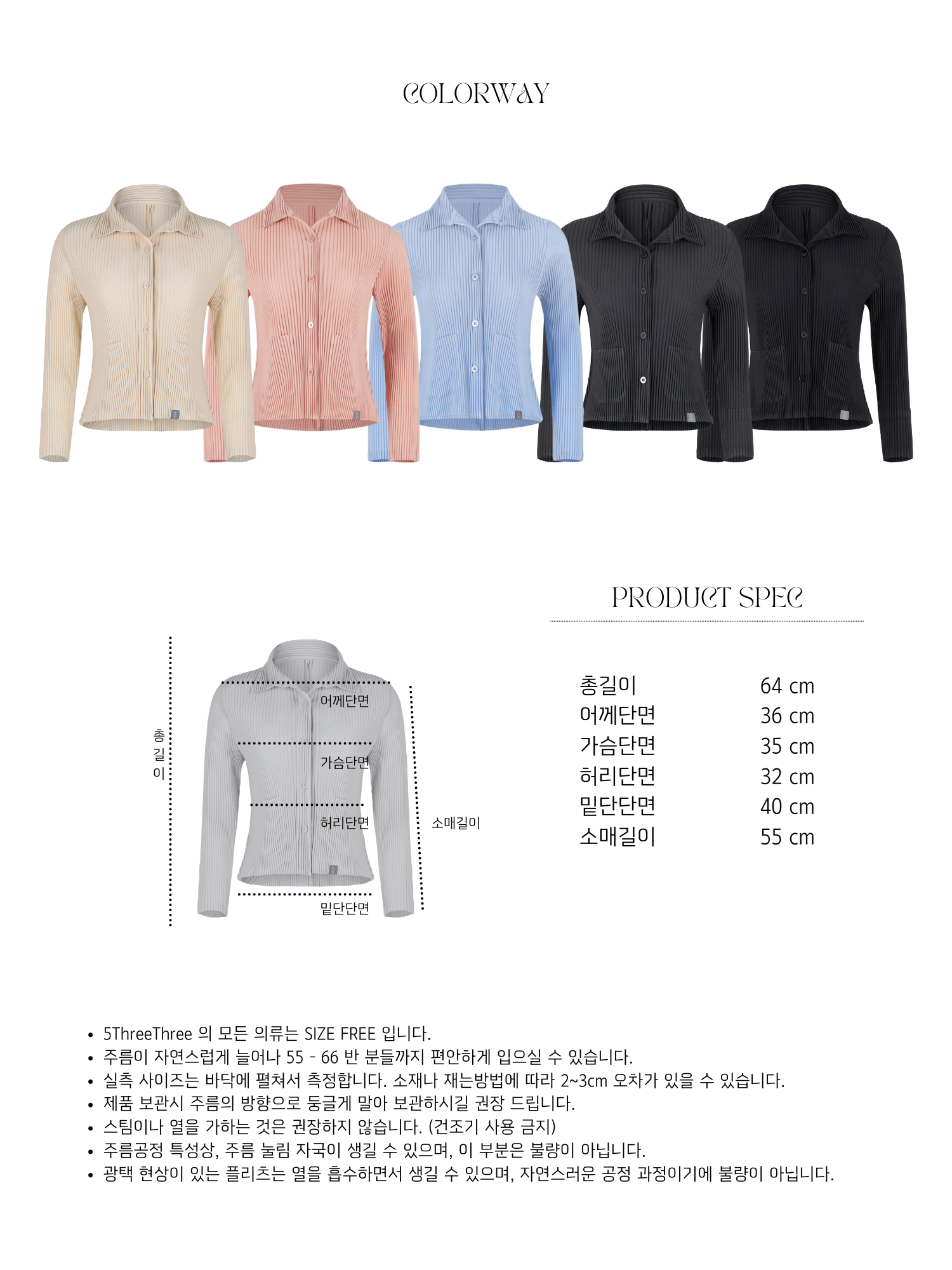 Fit Advise 5threethree 의 모든 의류는 Free Size 입니다. 55 - 66 반 분들까지 편안하게 입으실 수 있습니다. 보다 정확한 치수는 Product Spec을 확인 부탁드리겠습니다.