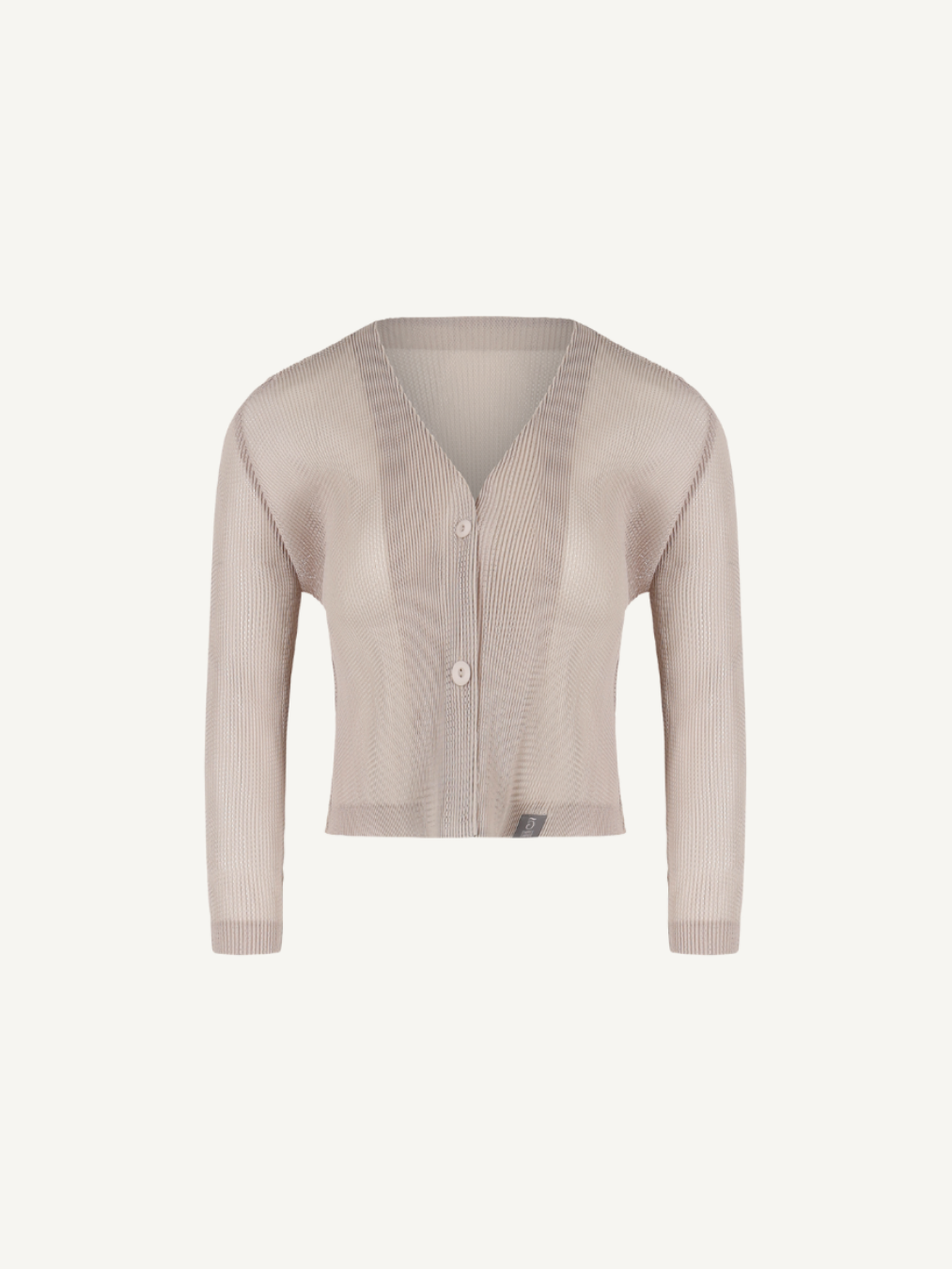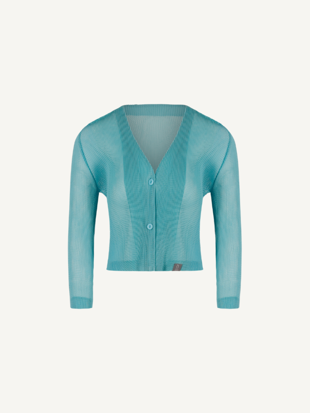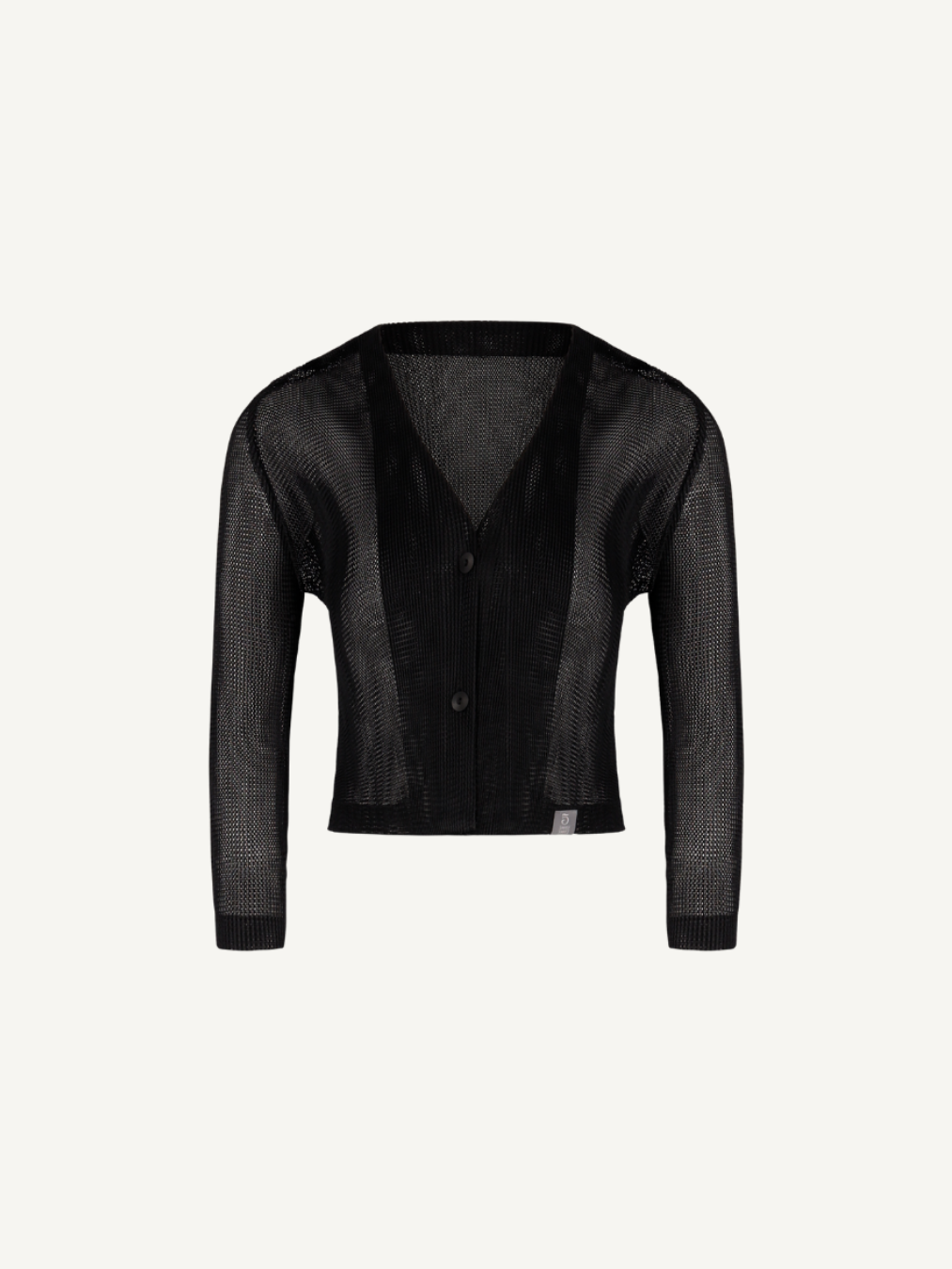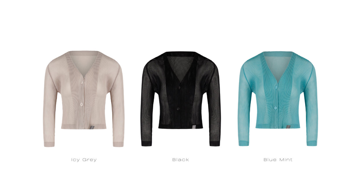 “Midi-crop cardigan that adds a seasonal mood with its lightly sheer mesh texture.”