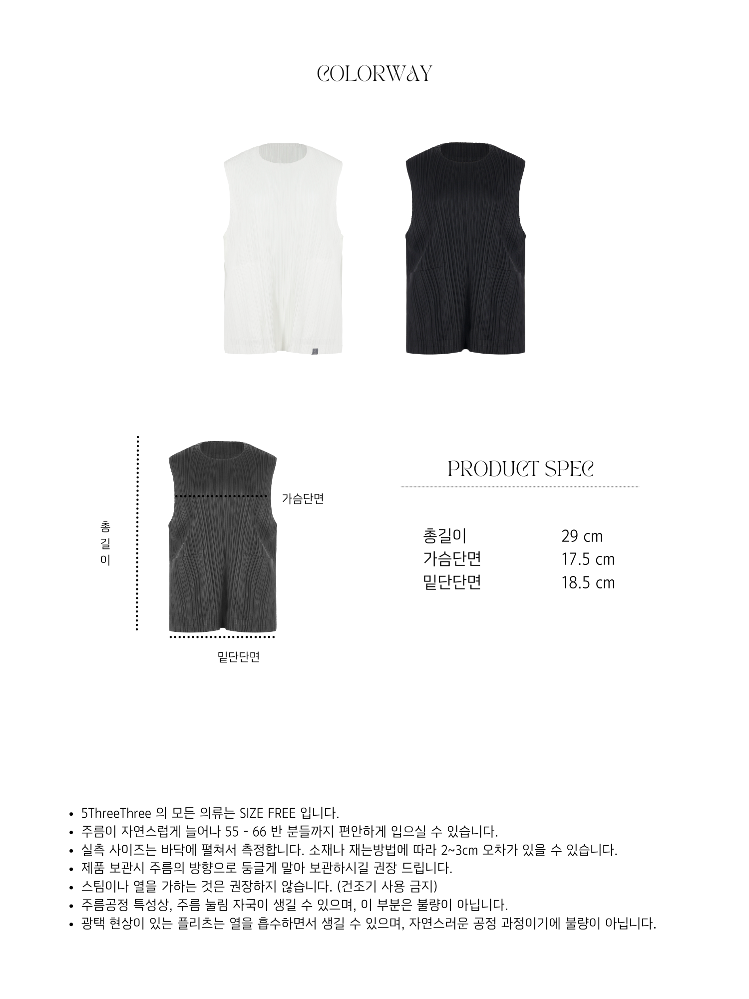 Fit Advise 5threethree 의 모든 의류는 Free Size 입니다. 55 - 66 반 분들까지 편안하게 입으실 수 있습니다. 보다 정확한 치수는 Product Spec을 확인 부탁드리겠습니다.