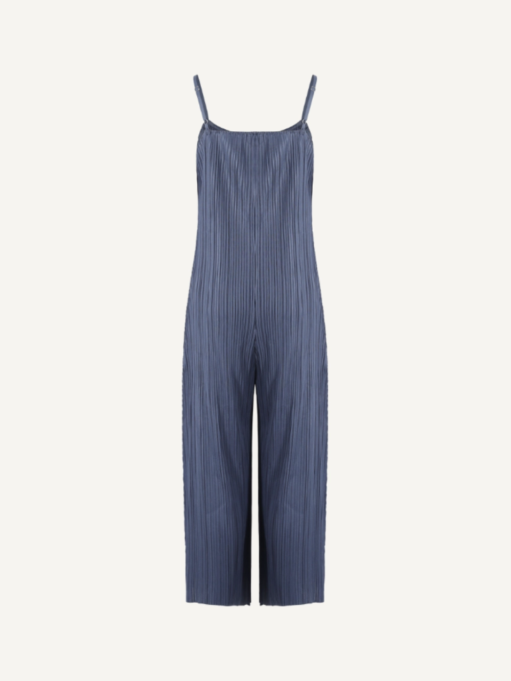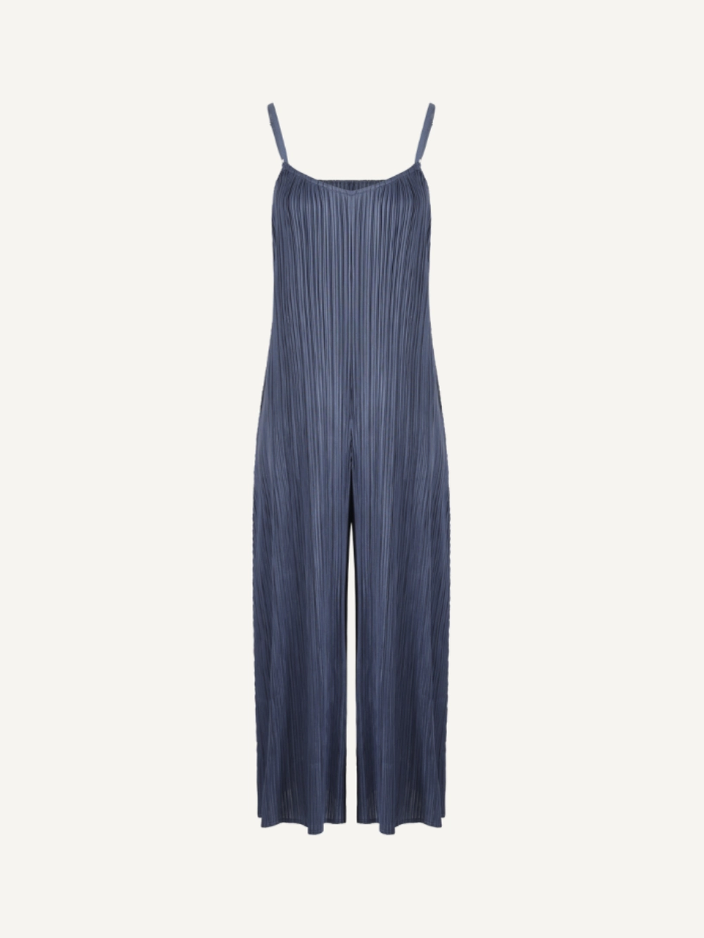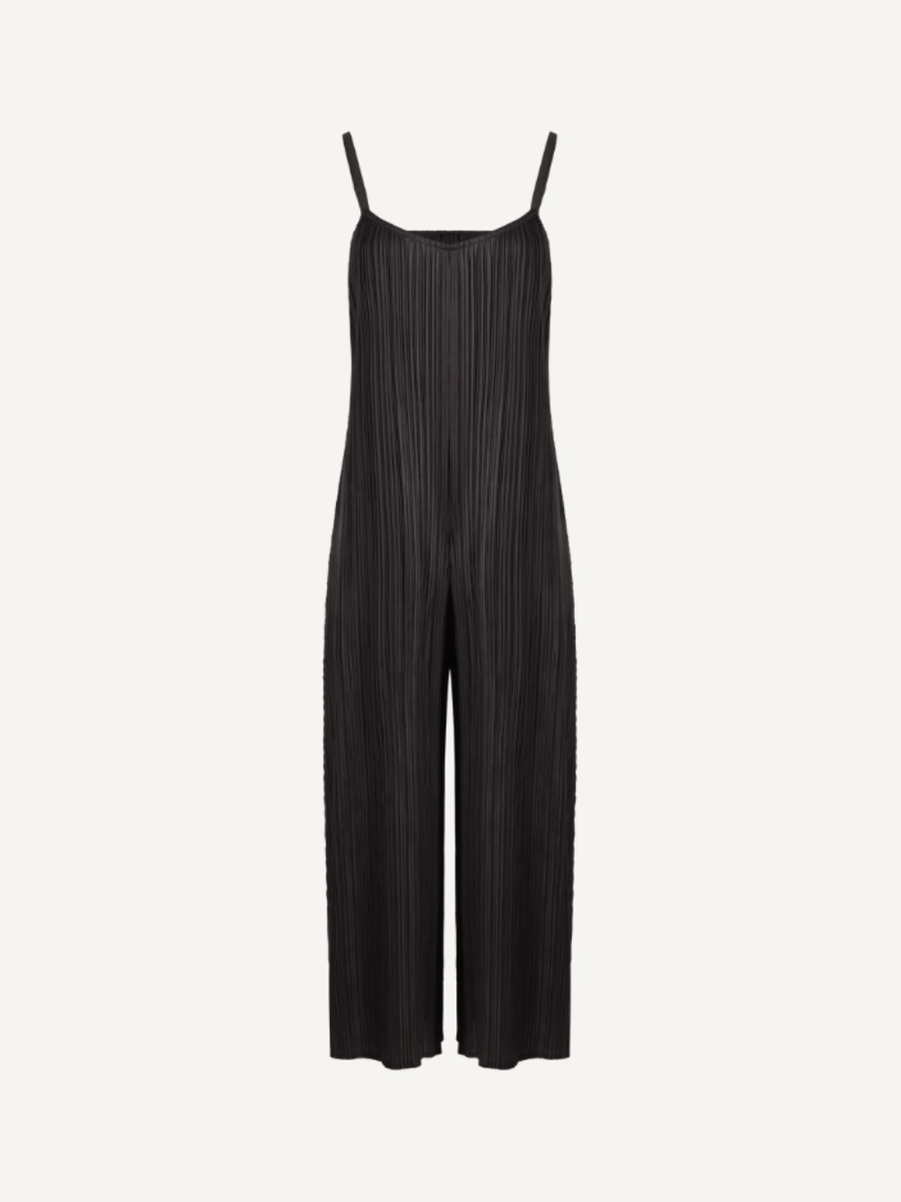 “Pleated jumpsuit with a slim, streamlined line, designed to create a polished silhouette even when worn on its own.”