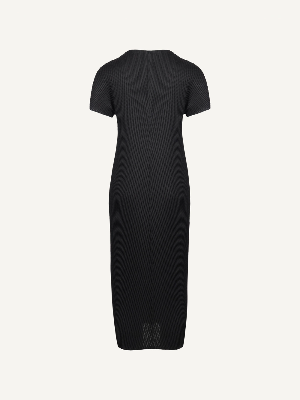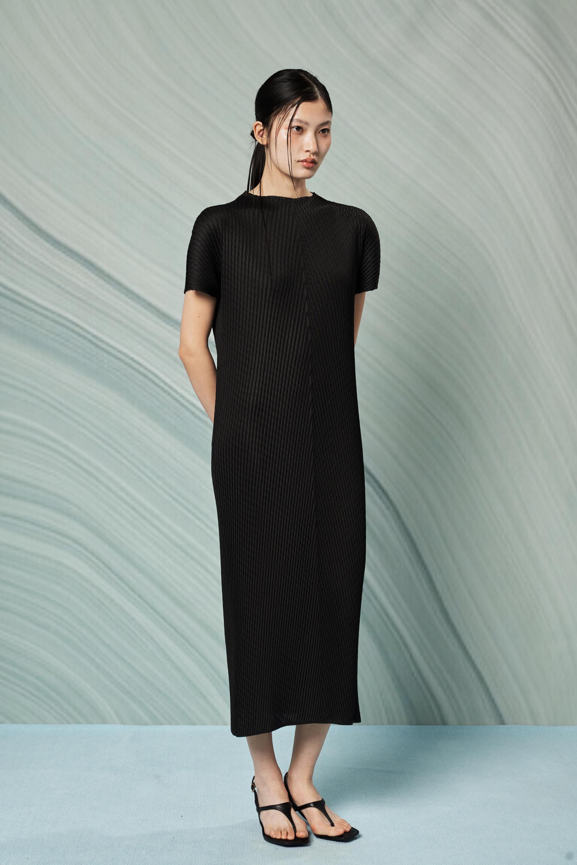 โVoluminous premium Fusilli pleats shape this dress into an elegant silhouette.โ