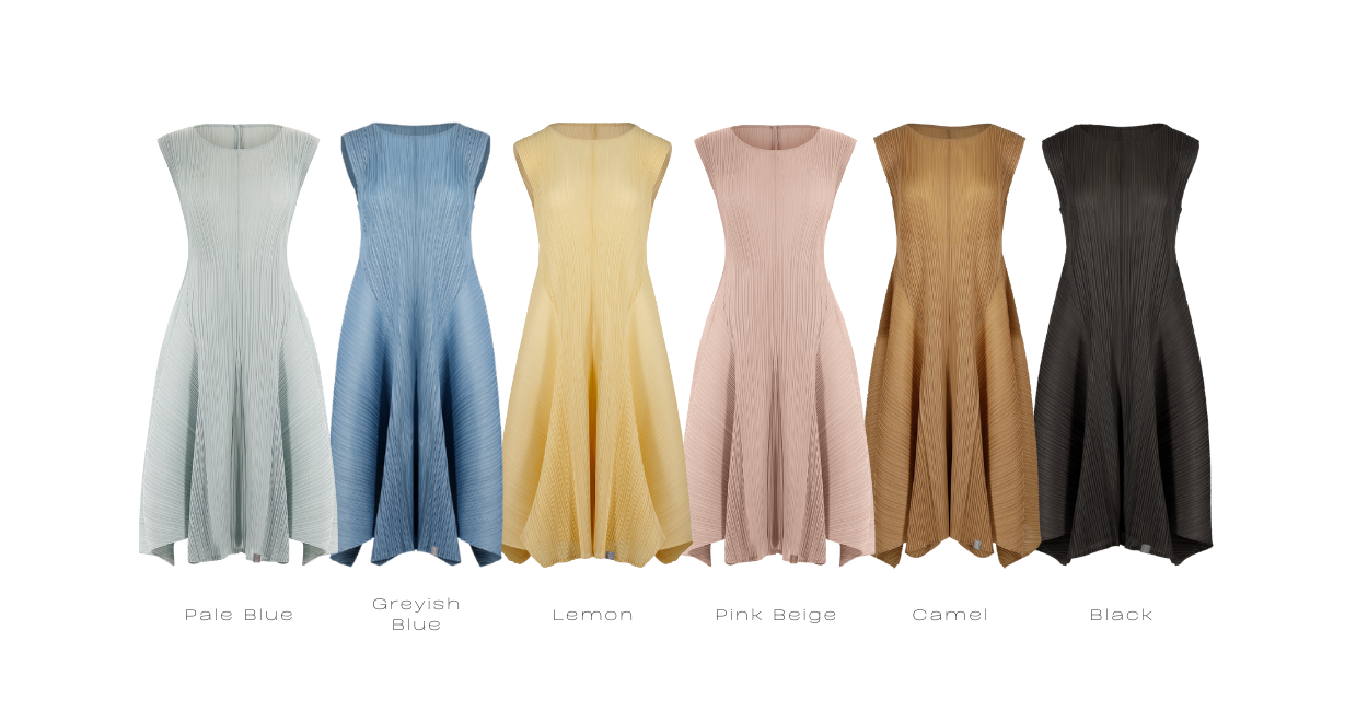 “Signature pleated dress where charming softness meets refined elegance.”